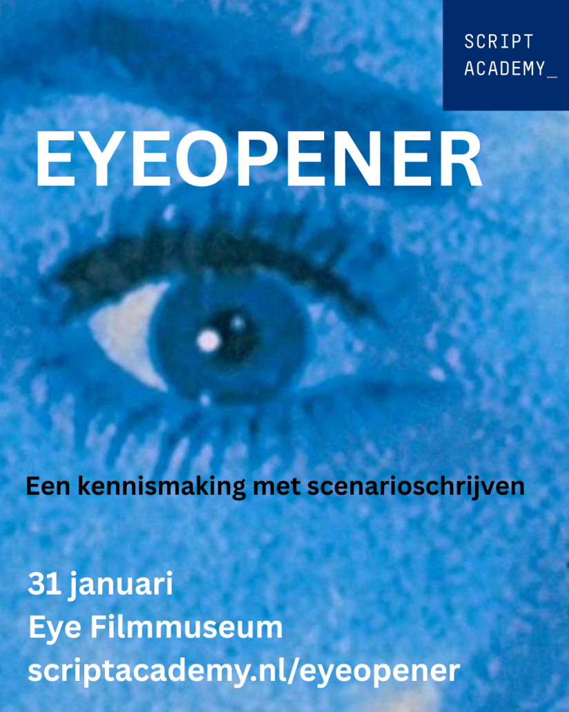 De Eyeopener vindt plaats in Eye Filmmuseum in Amsterdam van 13 tot 16 uur. Kijk voor meer informatie en aanmelden op. scriptacademy.nl/eyeopener .